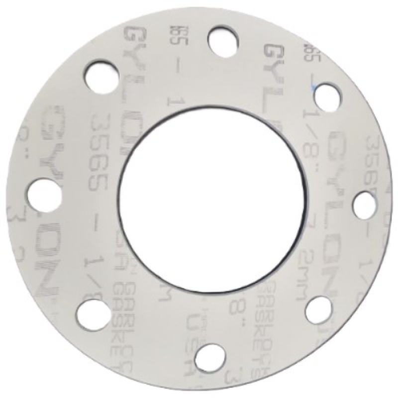 10 inch Full Face Gasket, 3565 Series Garlock, 1/16 inch Thickness, 12 bolt holes, Bolt Hole Diameter: 1.00 inch, Tempature range (F): 500 to -450, Pressure Class 150, Color: White, For Use With: Hydrocarbons, solvents, moderate concentrations of acids, Caustics, and Cryogenics, Gasket Compound Material: Microcellular PTFE, PTFE with Aluminosilicate Microspheres.